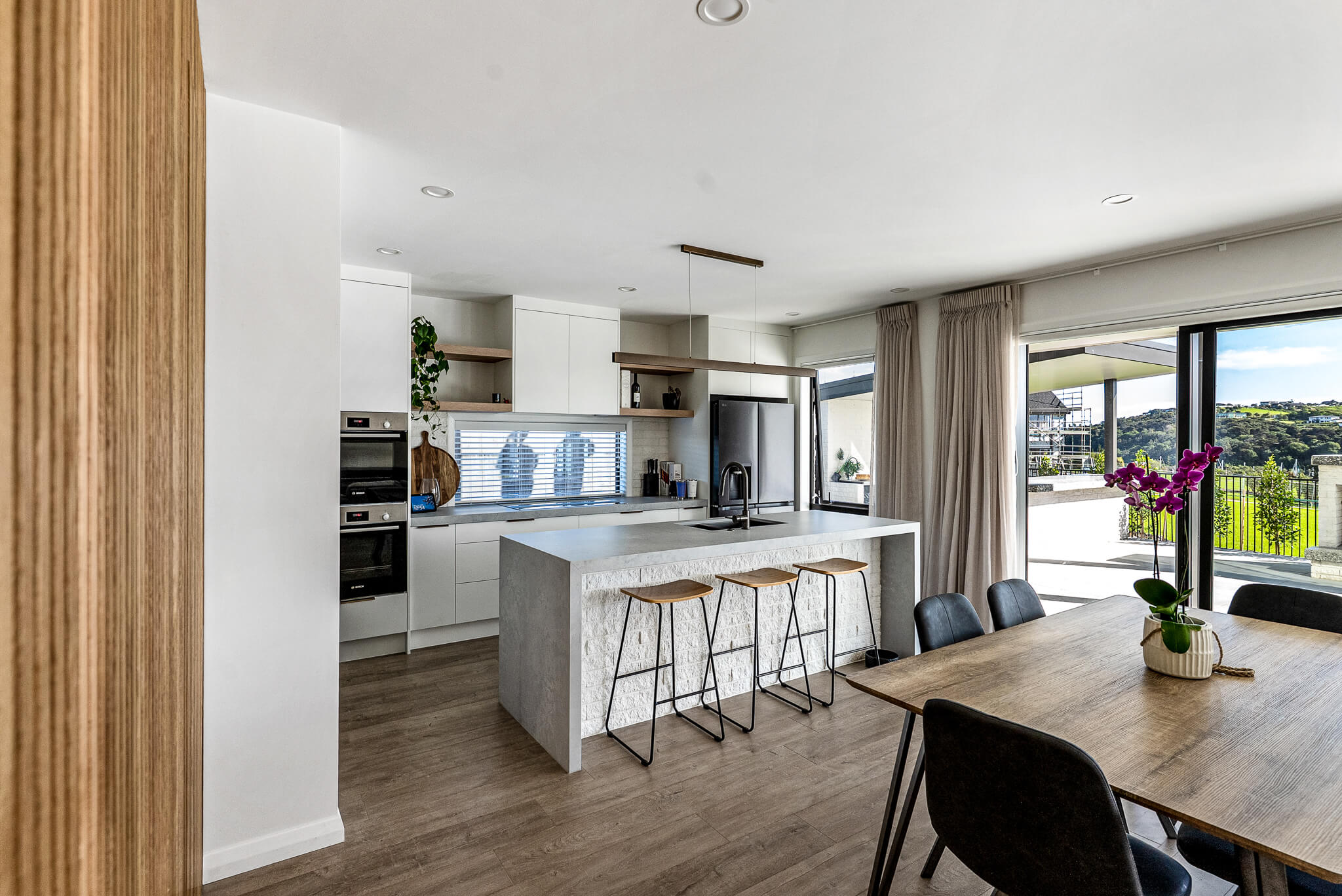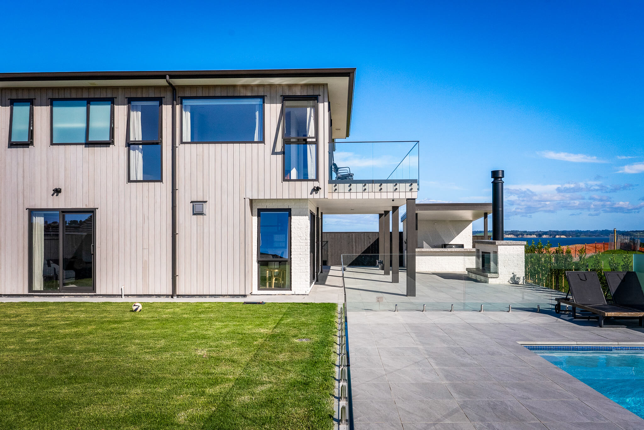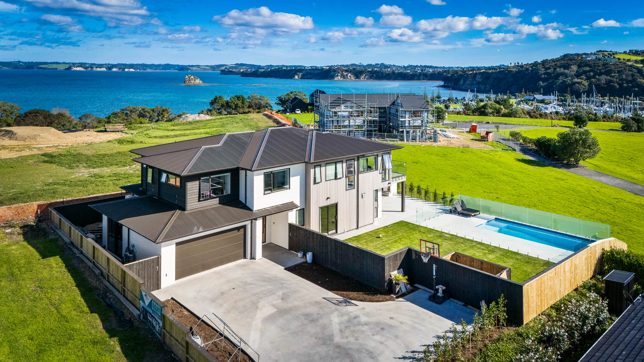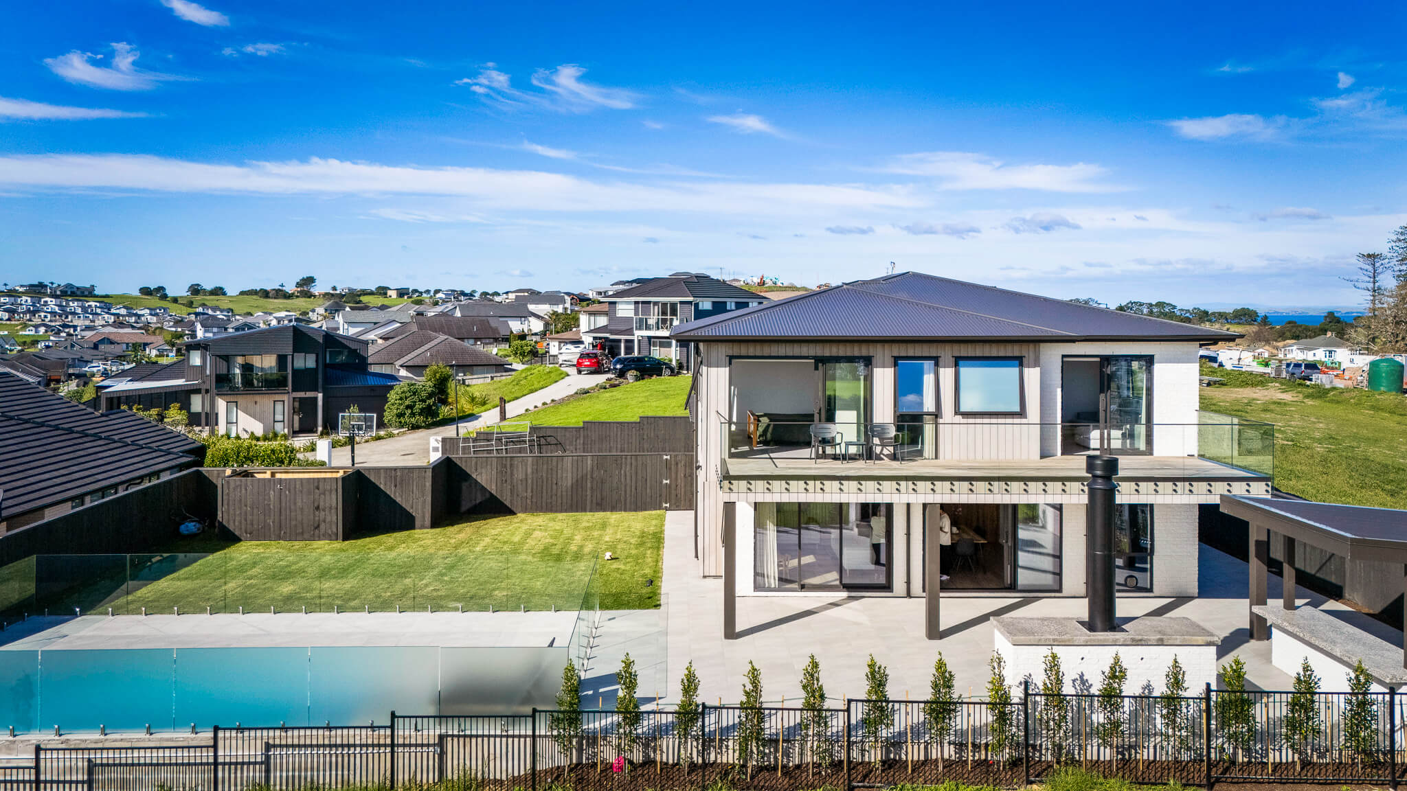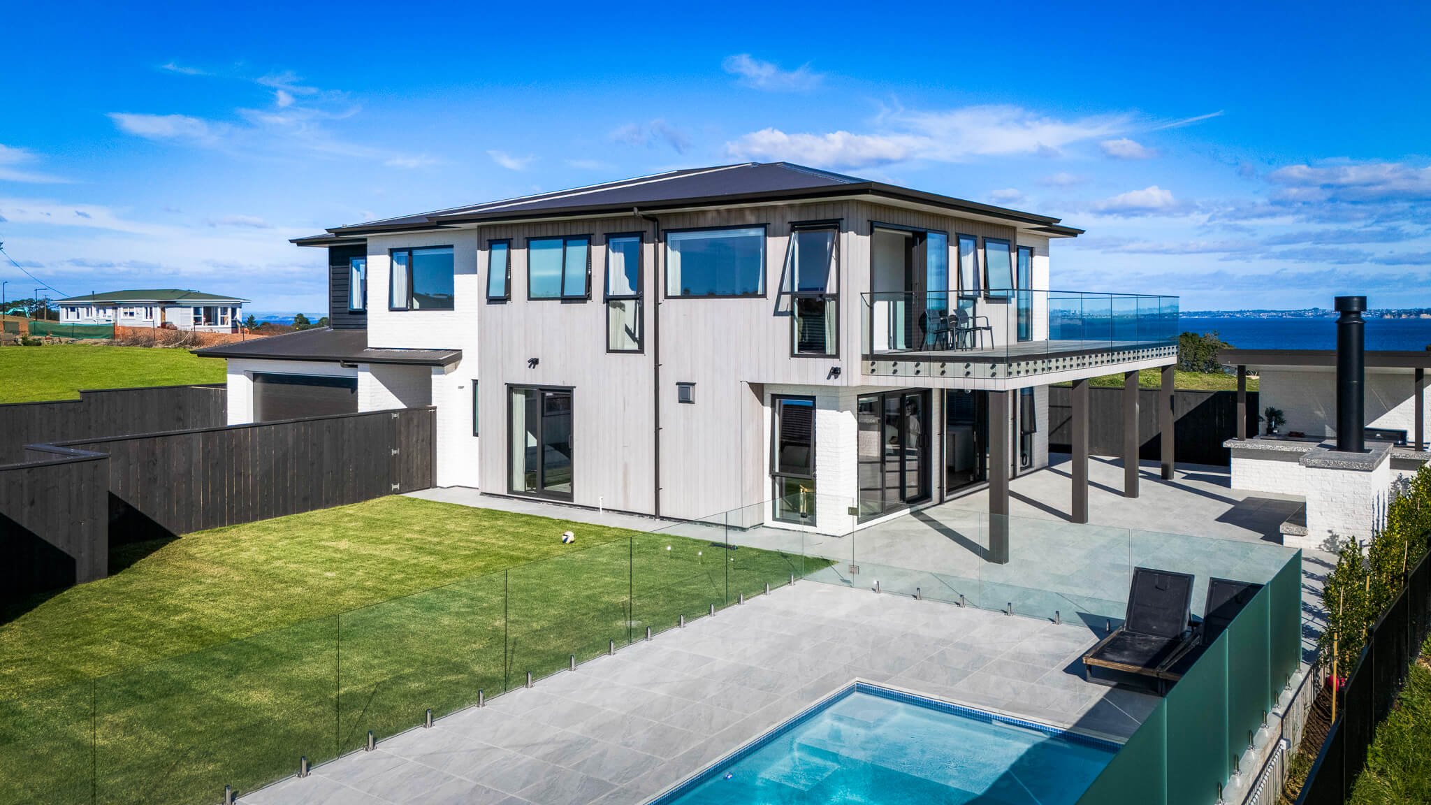 Set in the scenic Gulf Harbour, this 350m² home blends bold design with family functionality. Designed and built by Madison Park Homes, it features six bedrooms, five bathrooms, four living areas, and a private upstairs retreat for parents.