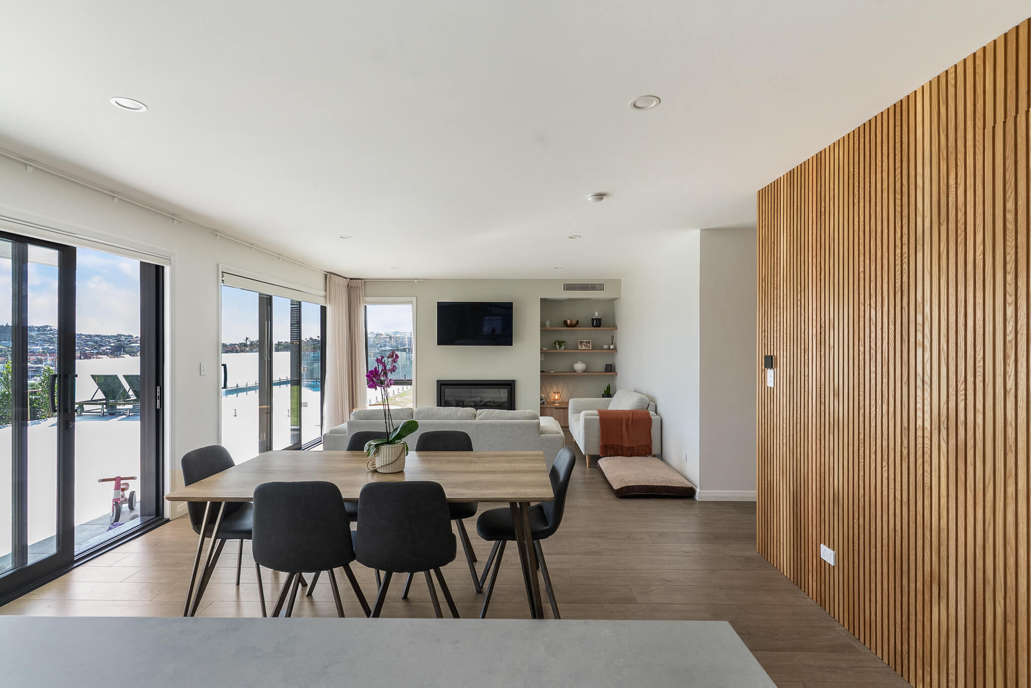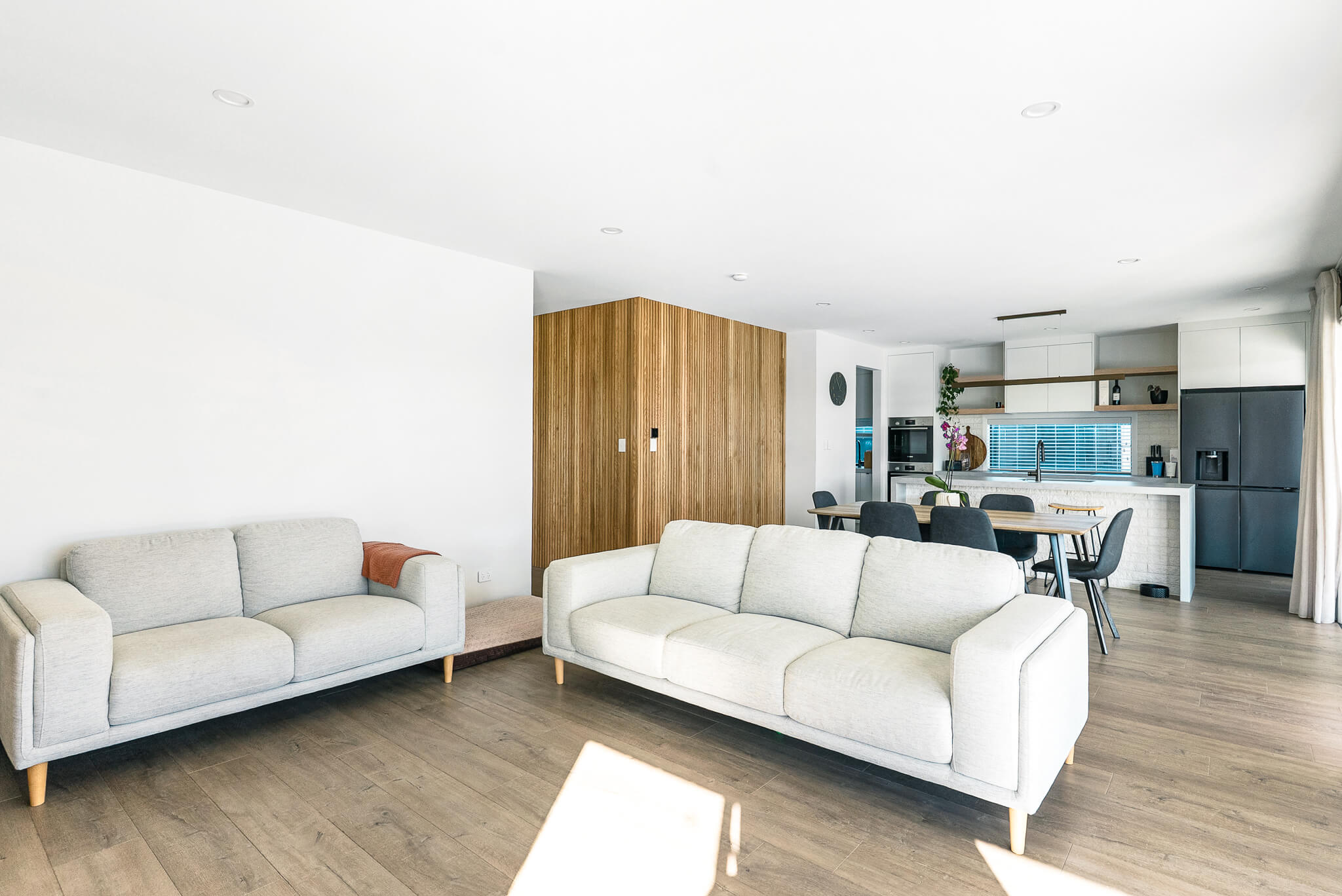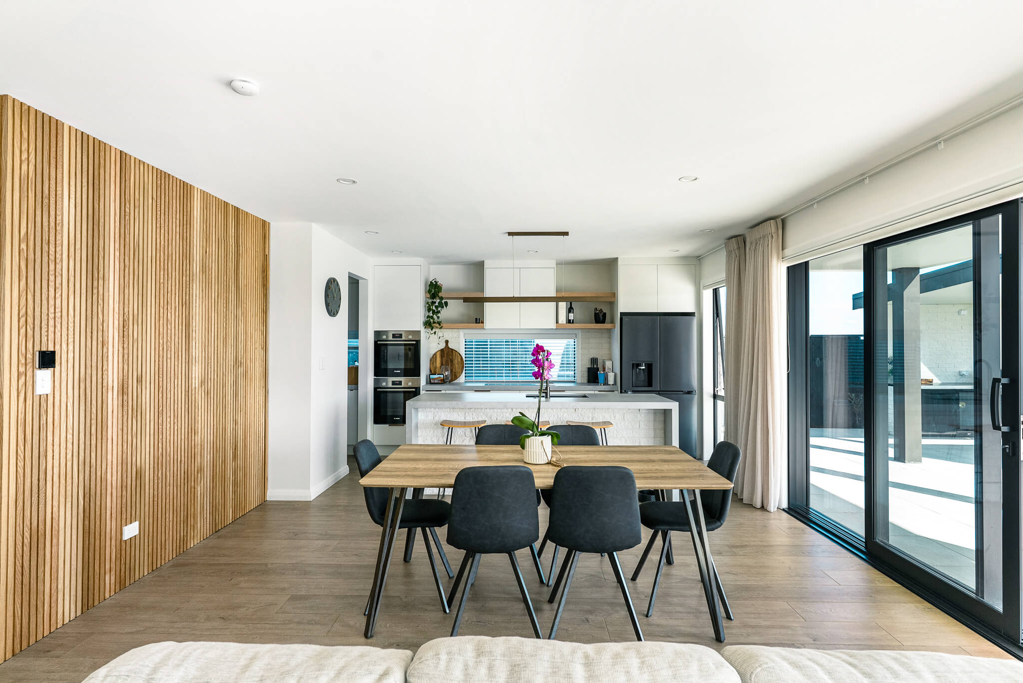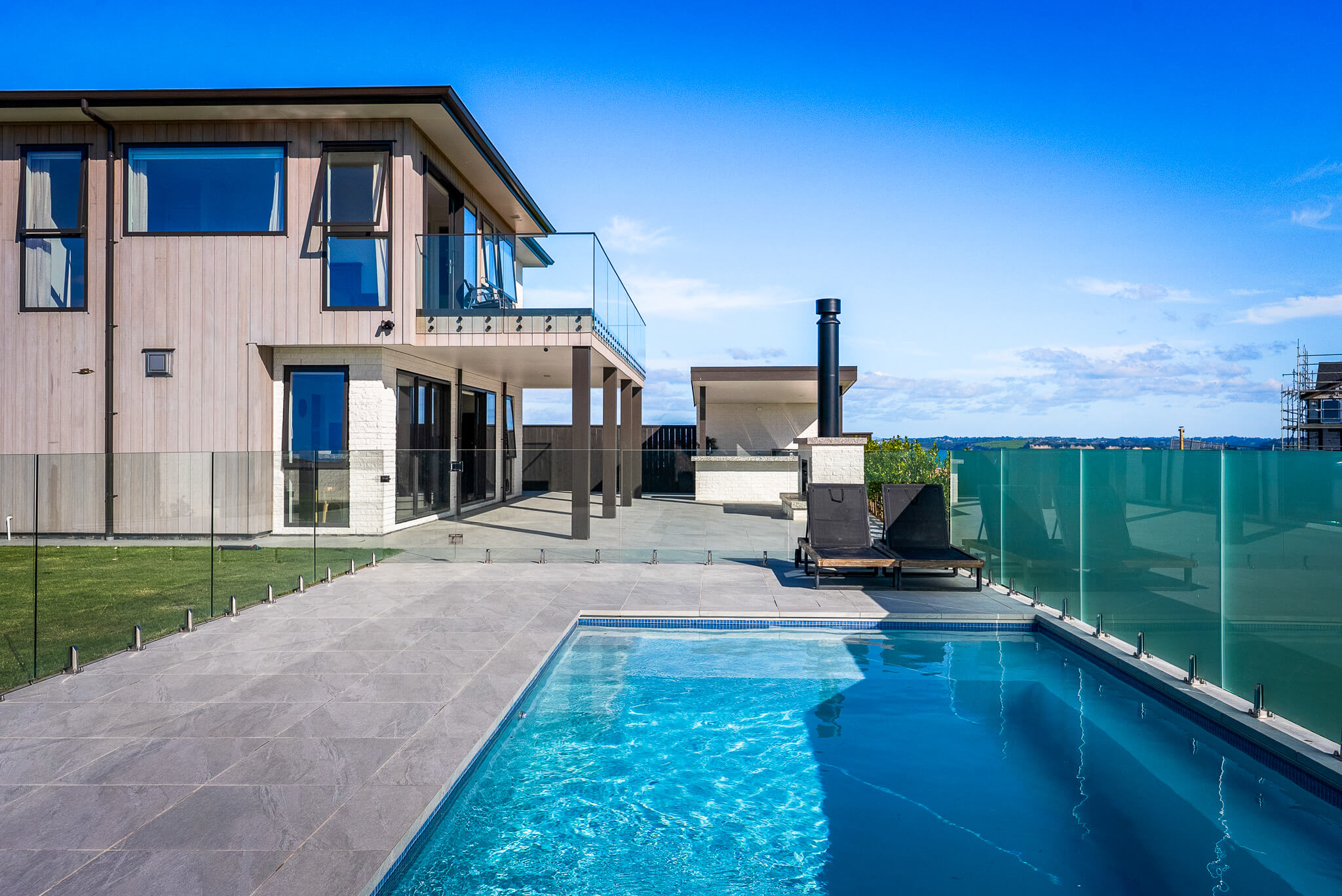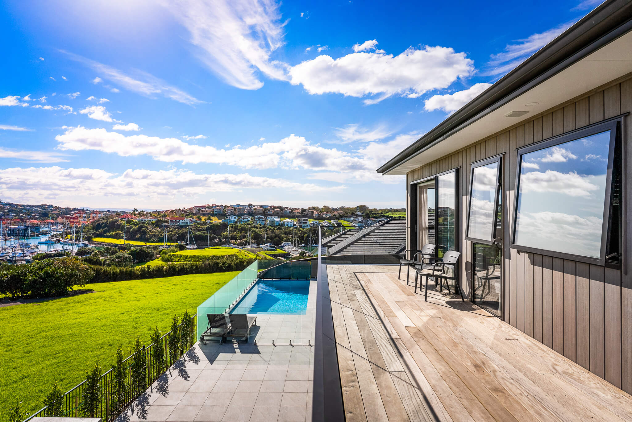 Set in the scenic Gulf Harbour, this 350m² home blends bold design with family functionality. Designed and built by Madison Park Homes, it features six bedrooms, five bathrooms, four living areas, and a private upstairs retreat for parents.