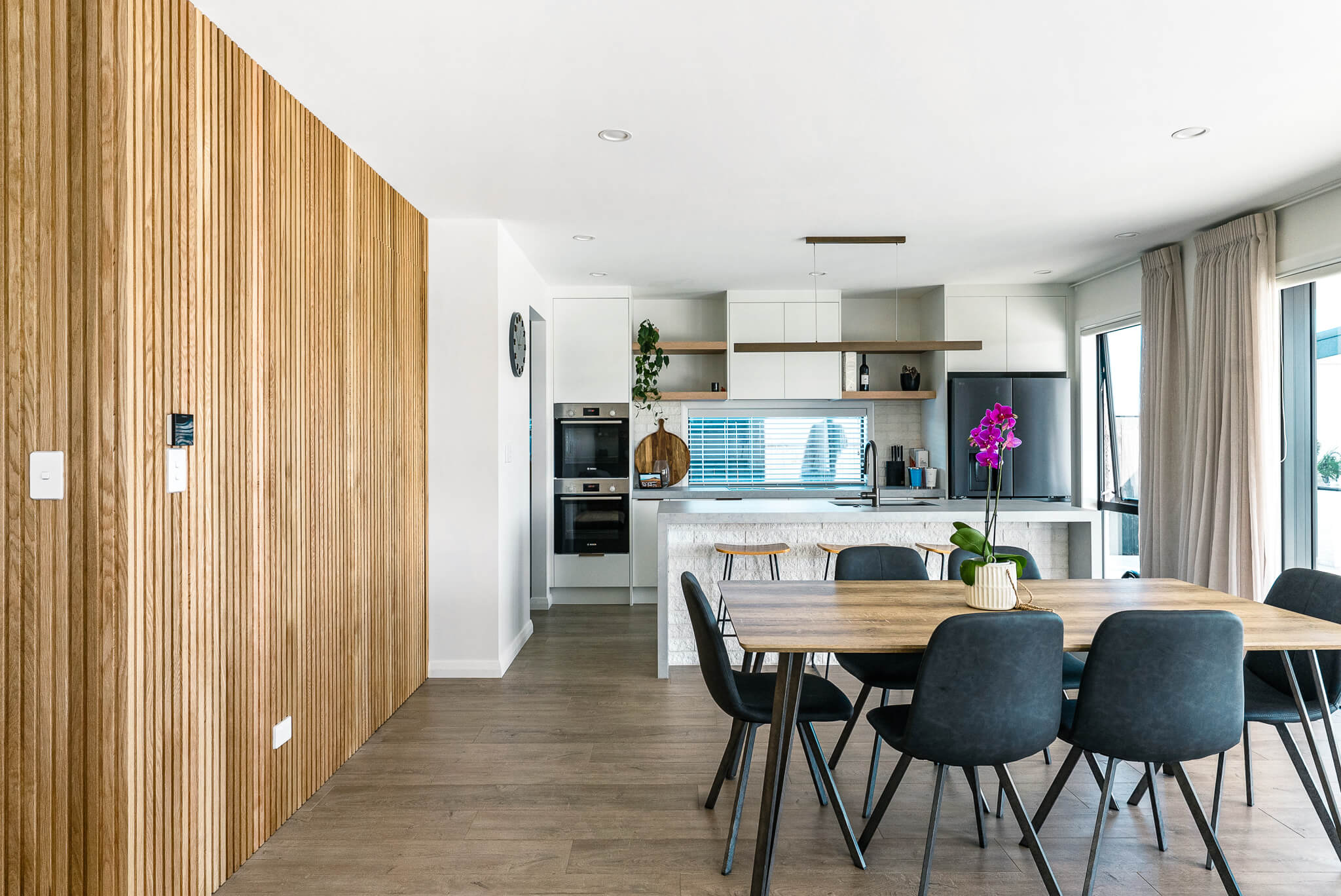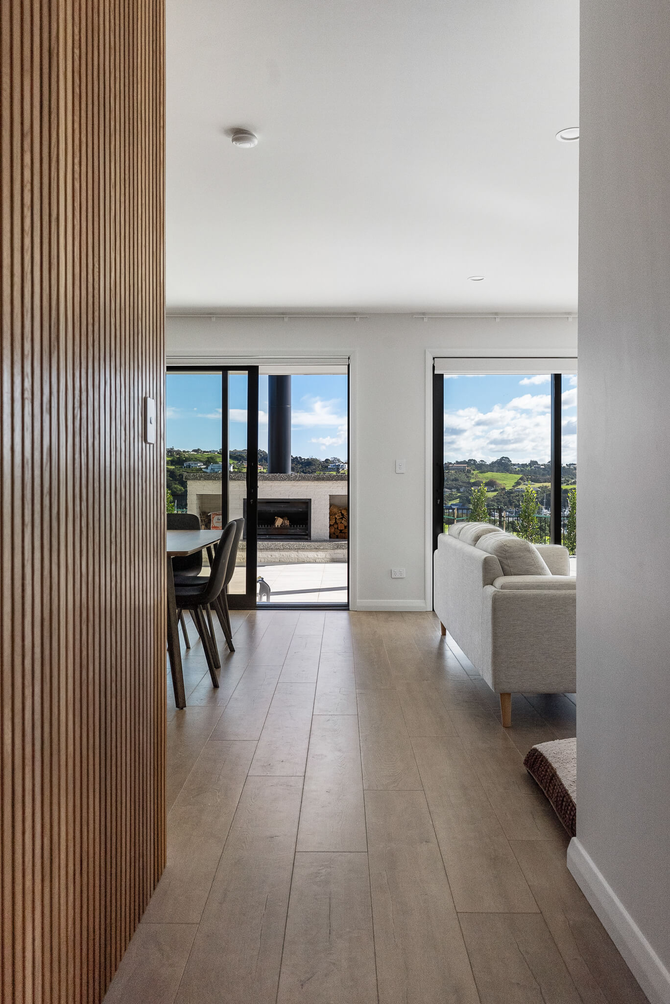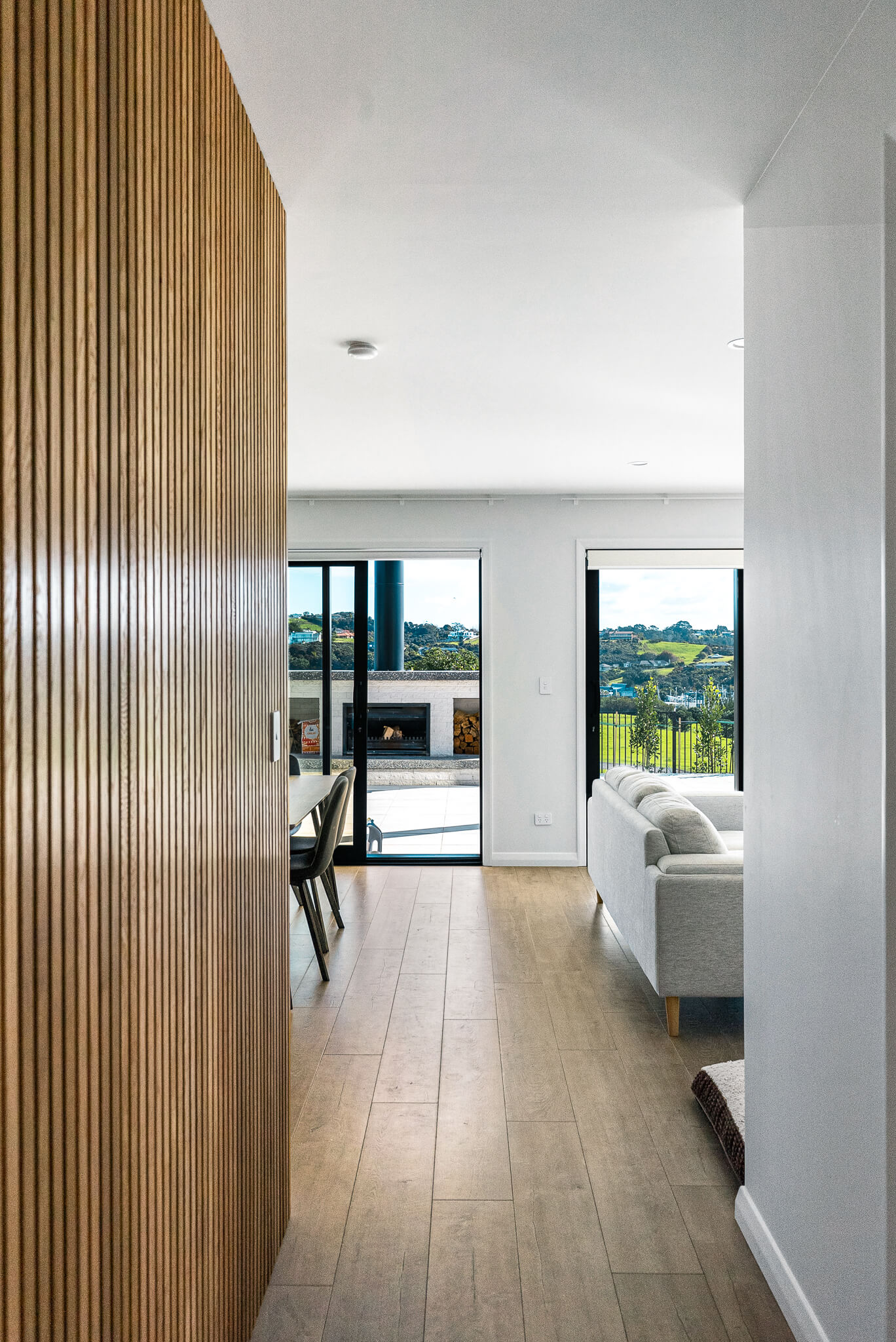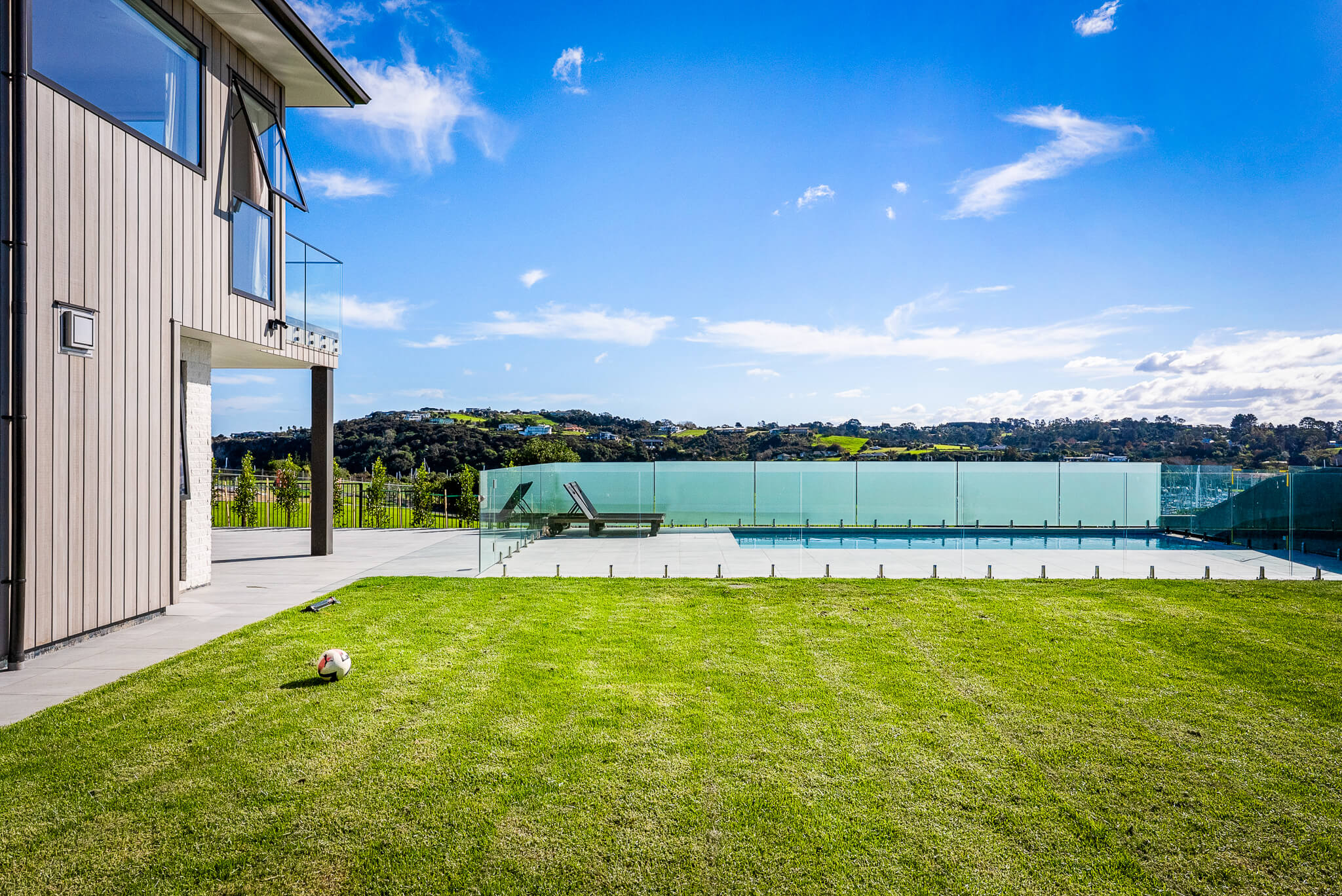 Set in the scenic Gulf Harbour, this 350m² home blends bold design with family functionality. Designed and built by Madison Park Homes, it features six bedrooms, five bathrooms, four living areas, and a private upstairs retreat for parents.